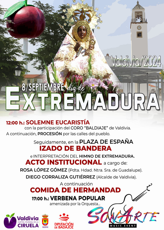 Fiesta tradicional 8 Septiembre 2024 - 8 Septiembre 2024 Valdivia Plaza de España, S/N. 06720 Valdivia (Badajoz) Extremadura, España ACTOS con motivo de la CELEBRACIÓN DEL DÍA DE EXTREMADURA Inicie sesión o registrese para enviar comentarios 39.033970037811, -5.7103637119208 Volver
